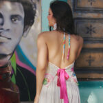 Top globo, detalle de pliegues en busto y tirantes para amarrar al cuello, encauchetado en espalda.